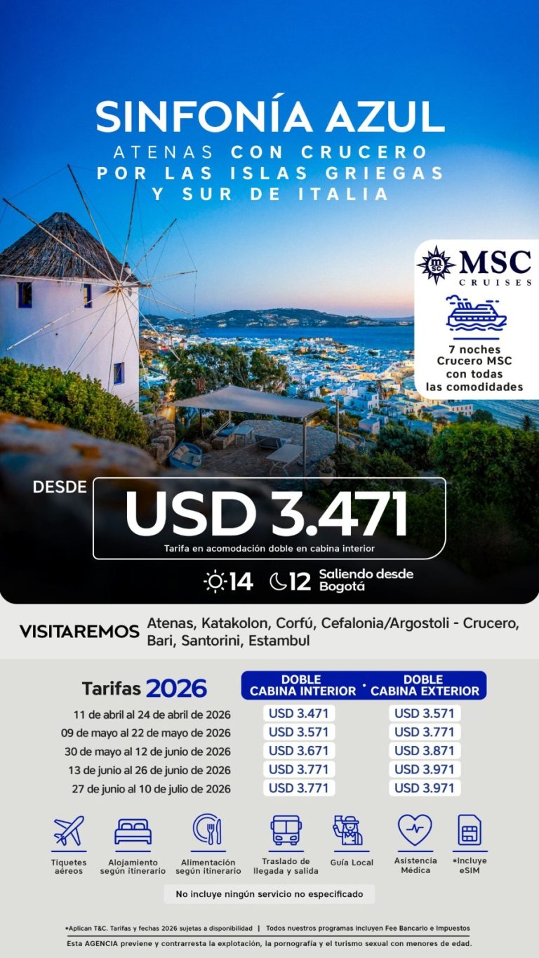 - Tiquete aéreo Bogotá – Atenas – Estambul – Bogotá vía Turkish Airlines con impuestos y 1 equipaje de bodega de 23 kg.
